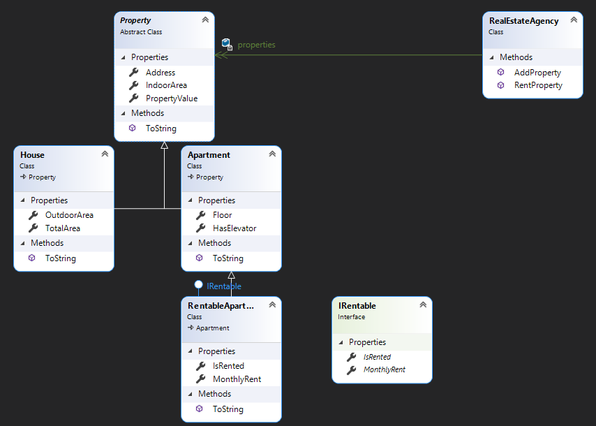 Create a class RealEstateAgency, which manages various properties. The property must be implemented using the following class diagram: